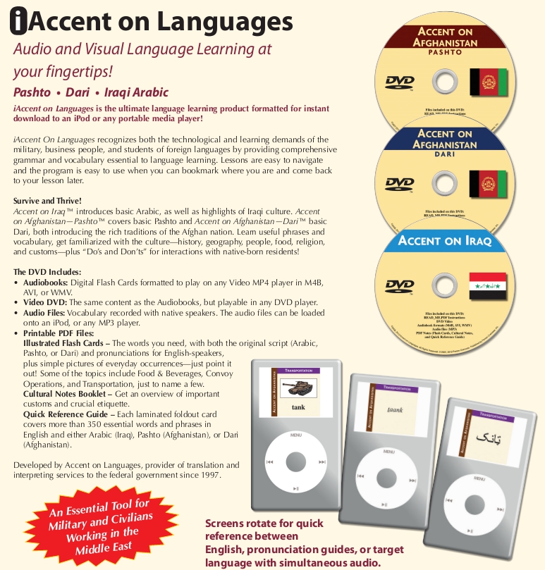 The cultural notes provide a detailed overview of the culture of Afghanistan, and "do's and don'ts" on Afghan customs and sensitivities. Accent on Languages has been providing translation and interpretation services to the federal government since 1997. Its founder has developed foreign language training audio tapes for over twenty years. This experience allowed us to tailor this product to help personnel communicate on the ground in Afghanistan. It was designed with the soldier in mind and can also be used by anyone. Accent on Afghanistan was presented at various Army language conferences where it received positive reviews for its compact design and learning tools.